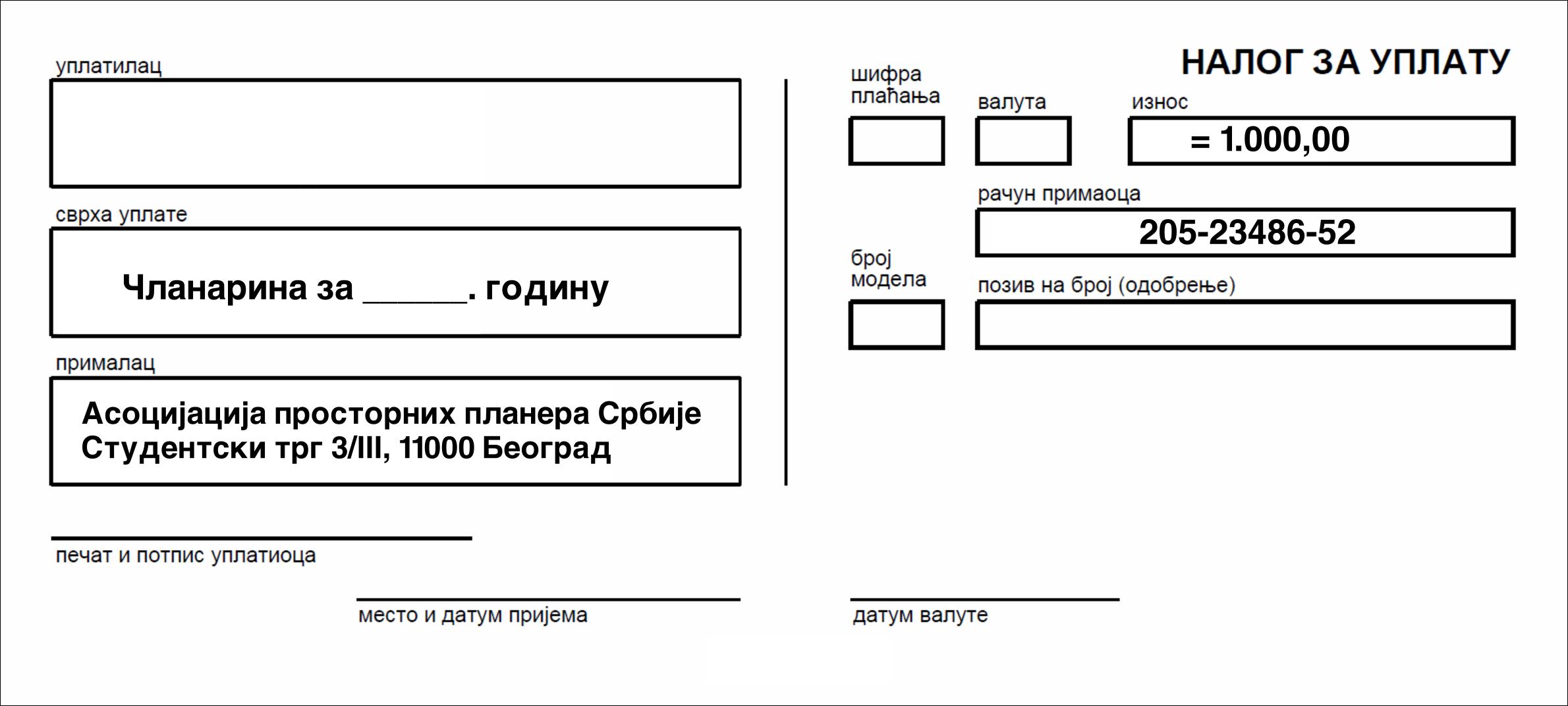 Popunjeni prijavni list i dokaz o uplati poslati na e-mail office@apps.org.rs ili poštom na adresu ASOCIJACIJA PROSTORNIH PLANERA SRBIJE, Studentski trg 3/III, 11000 Beograd.